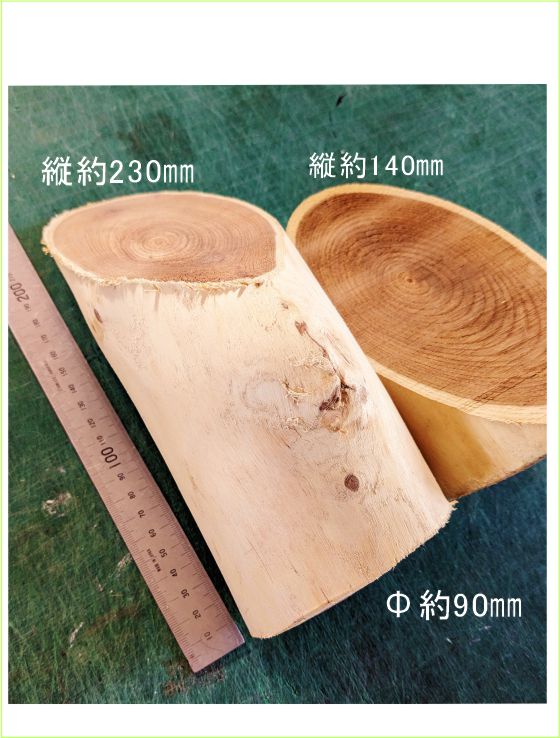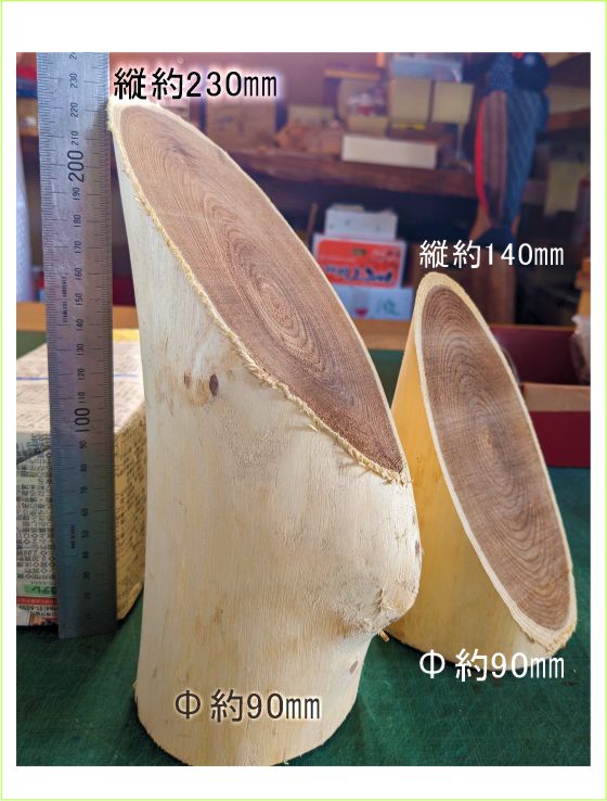 ■一番大きい材が 約Φ90×縦230㎜ 小さい材が 約Φ90×縦140㎜ほどです(Φはまん丸ではありません)。